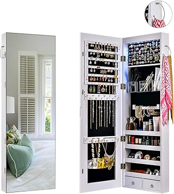 Giantex Led Jewelry Cabinet Box Amoire Door Wall Mount Lockable Touch Screen Light Built In Zipper Pocket Inside Makeup Mirrored Storage Jewelry Box Armoires With Lipstick Holder White 2019 Jewelry Boxes